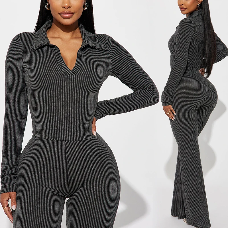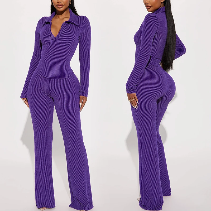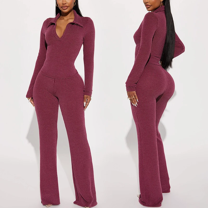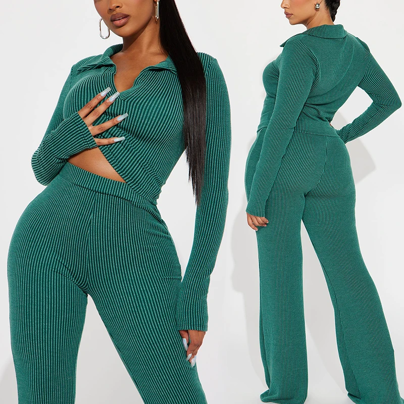 Huili Custom Logo Breathable Slimming Loungewear Stretch V Neck Shirt and Pants Fitness Ribbed 2 Piece Sets for Women